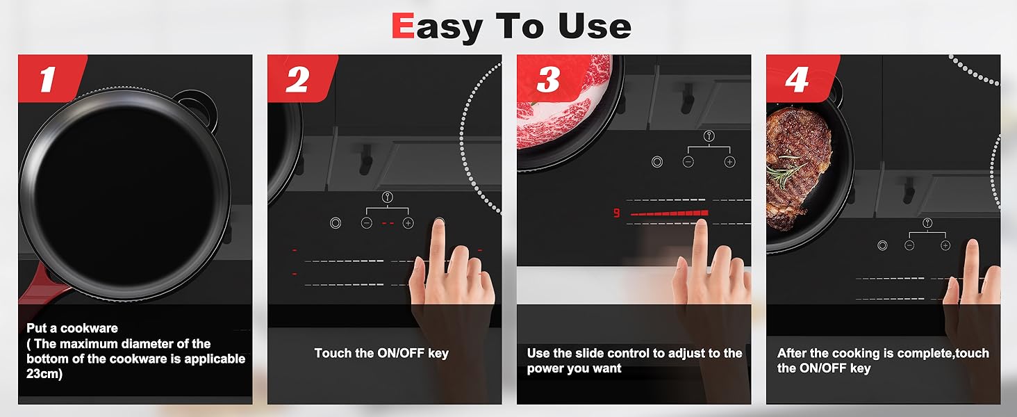 - Dual Ring Control: 4 Burner Electric Cooktop with Innovative dual ring design,Suitable for cookware up to 23cm diameter,Maximum power of 1800W for faster cooking.